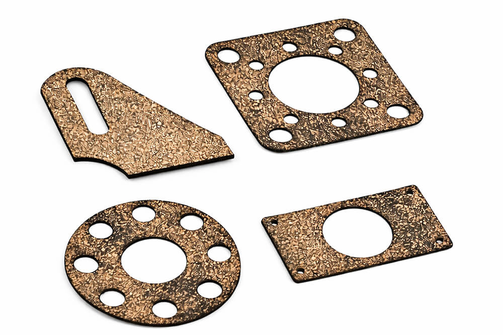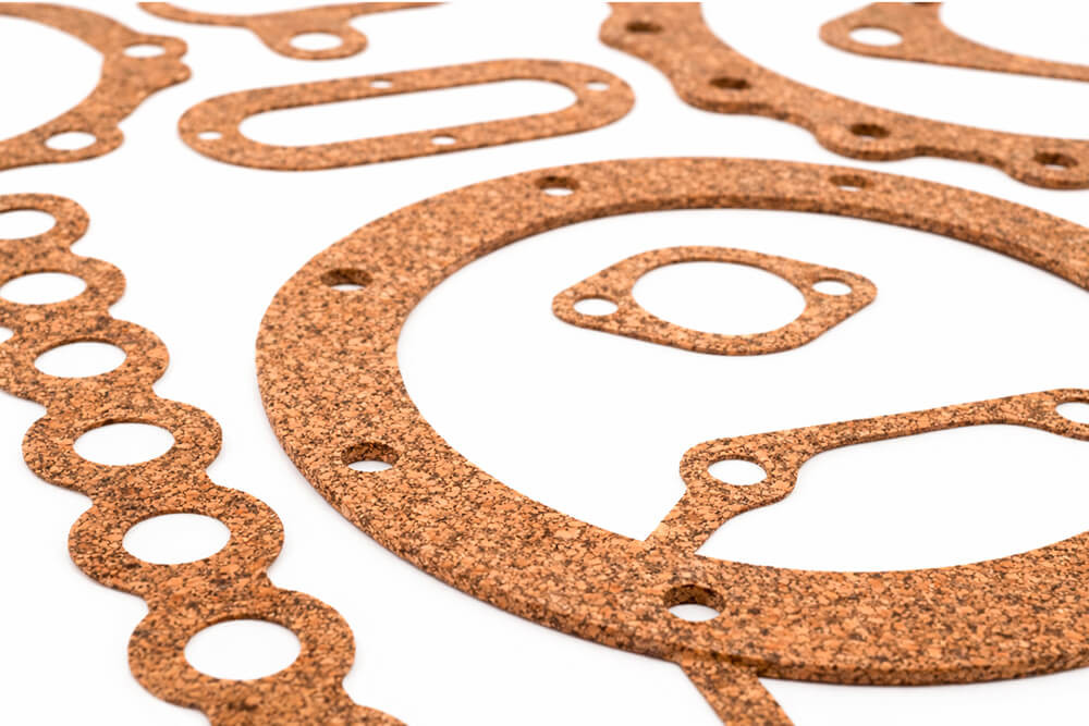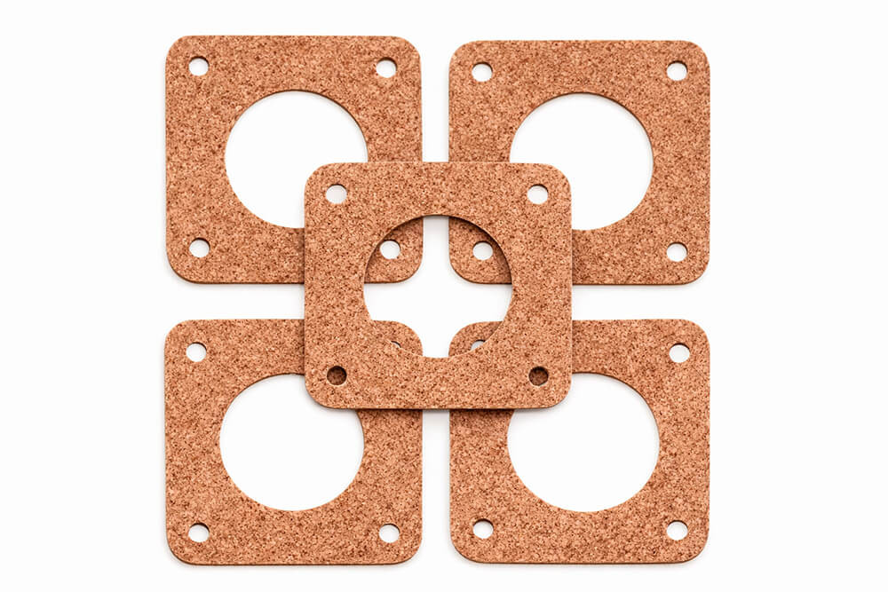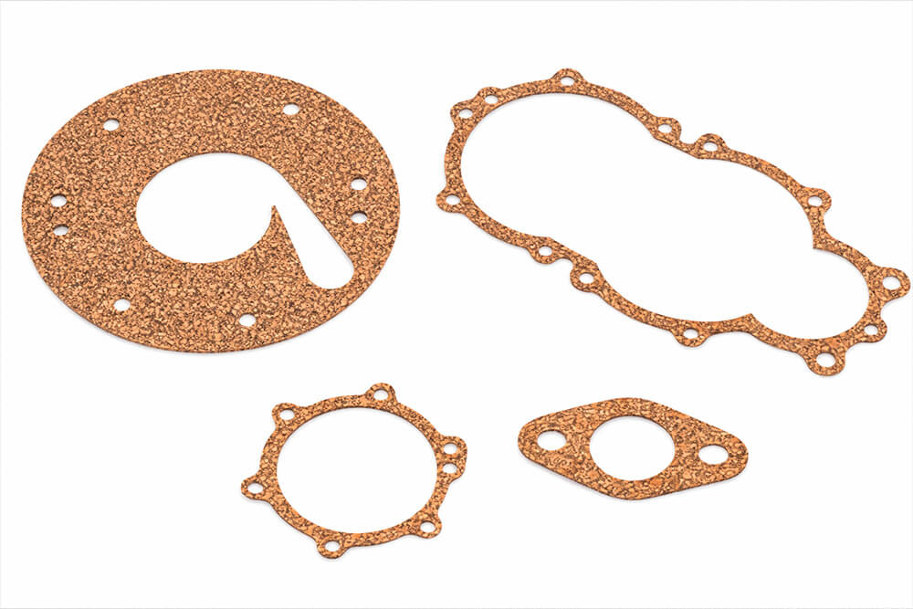 Gasket grade cork and cork/rubber composites are used where compliance, vibration control and sealing have to work together. We mostly cut cork gaskets for: