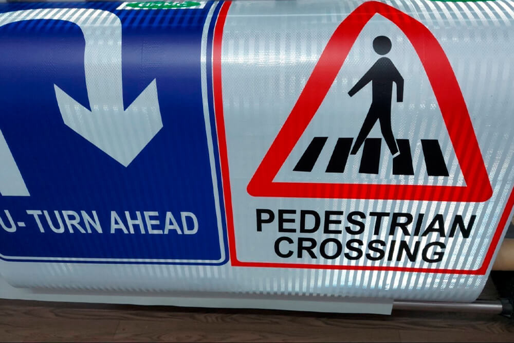 We work daily with reflective films for traffic, safety and wayfinding signage. Artwork, tiling and packing are all planned with real installation conditions in mind — from workshops to roadside crews.