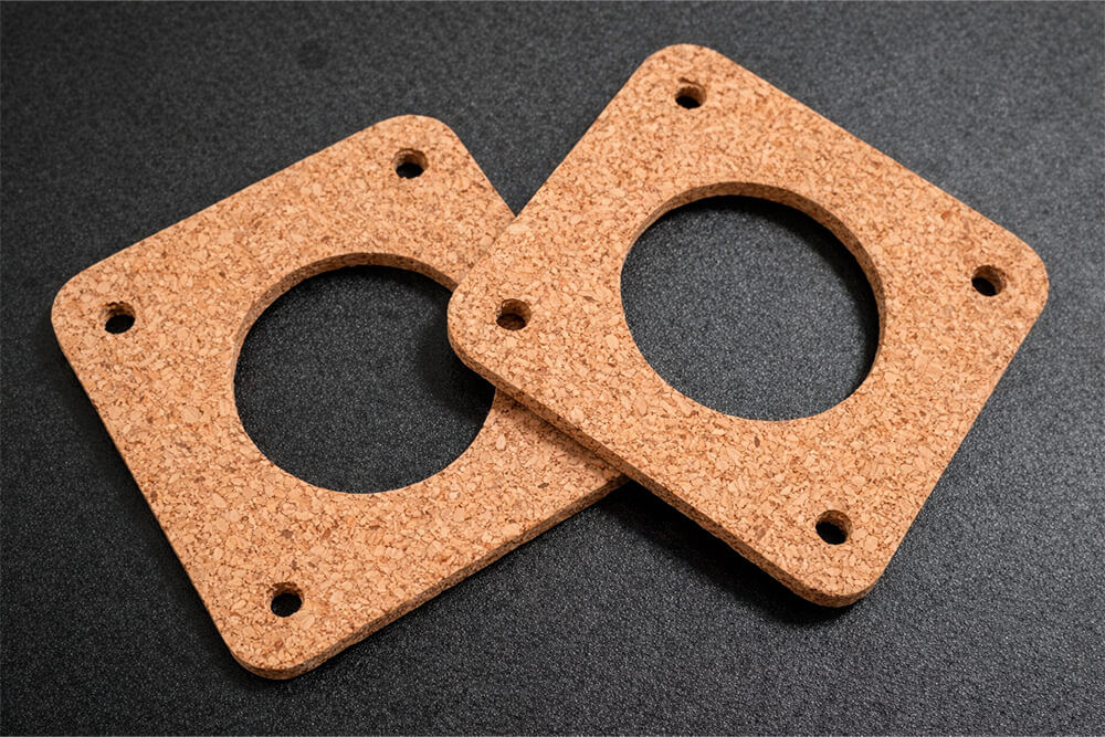 Gasket grade cork uses fine cork granules bound with elastomeric binders, often blended with rubber to improve fuel and oil resistance. It compresses under load, recovers well and conforms to irregular surfaces. We tune cutting methods around the grade, thickness and compressibility of your cork material.